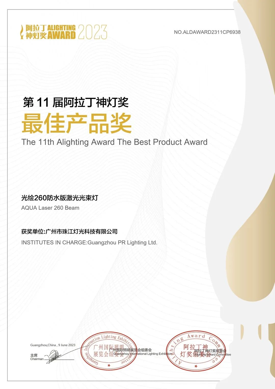 作為光亞展主辦的唯一獎項,「阿拉丁神燈獎」已經連續舉辦11屆,在業界引起極大關注反響,在廣州市經濟貿易委員會特別支持下,由廣州光亞法蘭克福展覽有限公司、廣東光亞照明研究院發起,已經成為照明行業具有國際影響力的專業獎項。
