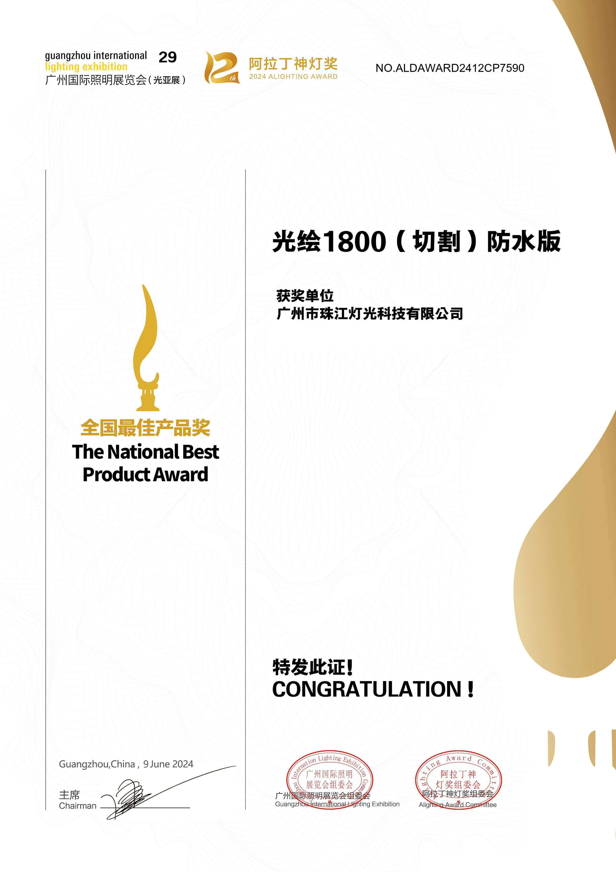 匯創新之力,赴光繪未來。作為中國照明行業的領先智造企業,珠江燈光「光繪1800(切割)防水版」電腦搖頭切割燈榮獲第十二屆阿拉丁神燈獎最佳產品獎。
