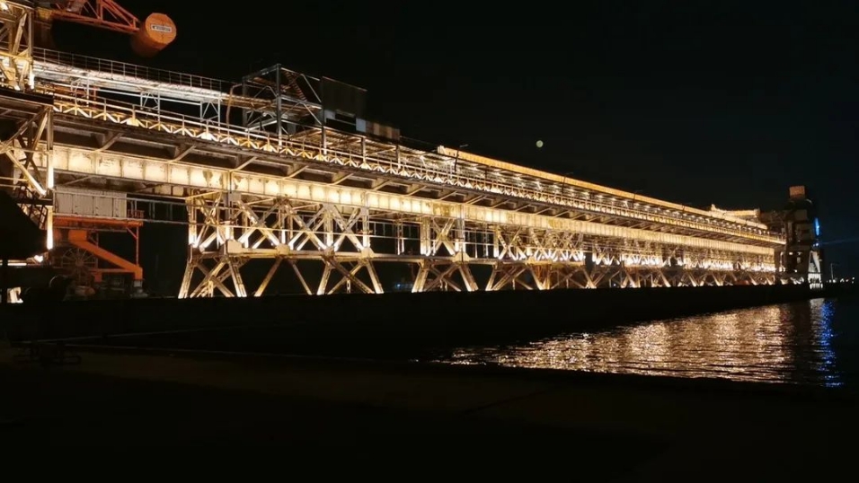 依托龍門架區(qū)域的建筑造型,珠江燈光染色投光燈與圖案燈演繹《海上傳奇》篇章部分,如巨龍橫臥海岸線,聯(lián)動代表大連歷史文化的煤碼頭遺址和代表大連體育精神的梭魚灣專業(yè)足球場等,展現(xiàn)出宏大的城市名片。